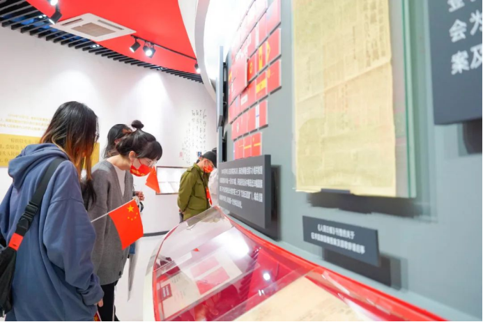 忆往昔峥嵘岁月,筚路蓝缕、栉风沐雨,不变的是鲜红的旗帜,不变的是华夏儿女赤诚的初心。移步至国旗诞生厅内,讲解员向大家讲述了设计者曾联松从缘起到邂逅、与五星红旗之间的故事。通过五星红旗诞生的故事,党员重温了国旗的设计理念。了解国旗的制作、国旗的涵义、国旗的标准等内容,感受“一旗、一人、一馆、一城”的情缘。