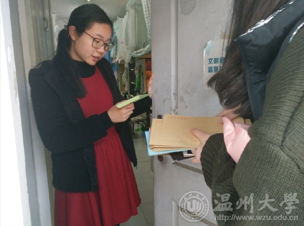 2016年12月28日,黑料网 “艺家人”青年志愿者协会在超豪学区开展了弘扬“雷锋”精神的“爱心邮递”活动。 在数字化信息化的时代,人们似乎已经忘记了在通讯技术落后的年代里如何将情感用文字嵌入信中,并让它飘向远方,表达内心情感。此次活动号召通过以信件的方式写下对他人的祝福或者感谢,由志愿者们送到收件人的手中,正是对从前慢节奏的情感交流很好的体验。活动受到了广大同学们的一致好评,同学们纷纷将想说的话写在信纸上,在收齐信件后,小邮差们穿梭在各栋寝室楼内,他们轻叩房门微笑地送上手里的信件,并与收信人合影留念。 图/文:王伟