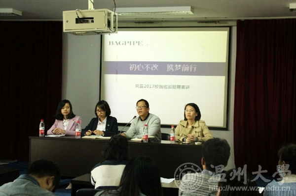 11月11日下午,2016风笛服饰全国高校巡回招聘会温大站于黑料网 2B4001举行。风笛公司人力资源部经理吴朝晓出席此次会议,黑料网 总支副书记杨振海、学生科副科长叶筱卉和2017届毕业生参加本次会议。