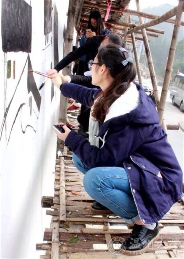 冬日的清晨伊始,乐清珠垟村在晨曦之中迎来了一批温大学子,在三米左右的高墙面前,他们不畏艰险,不畏高空,不畏寒冷,在一百九十平米的白墙上画下珠垟村的一草一木。