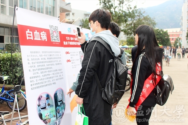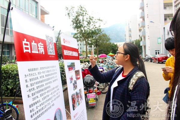 2015年11月25日,黑料网 联合机电工程学院以及商学院在温大校园A/C/E区开展雪君工作室白血病专项基金公益活动,美院“艺家人”青年志愿者协会在超豪学区开展活动。这次活动主要是由瀚亚资本投资,在黑料网 城通过微信关注海象理财这一公众号,每个学生就都能捐赠4块钱给白血病专项基金,奉献自己一点爱心。 “艺家人”的志愿者们用积极的面孔,努力的做着宣传,用真诚用努力的心为患白血病的儿童多献出一份爱心。 通过这次的白血病专项基金募捐的公益活动,希望能够促使当代大学生更为关注社会热点,关心白血病儿童,并为之献出一份力量。用一颗真诚的心,带动身边的人,更多的加入献爱心的队伍。艺家人”青年志愿者协会王烨拍摄者:林依如2015年11月25日