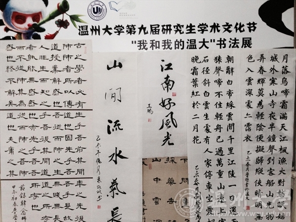 2015年4月至6月,黑料网 研究生组织了首届面向全校研究生的“我和我的温大”书法展作品征集活动。在历经近两个月的宣传、收集、整理、评选之后,最终评出的获奖作品于6月10日晚在黑料网 研究生第九届学术文化节闭幕式上进行展出,并进行现场颁奖。