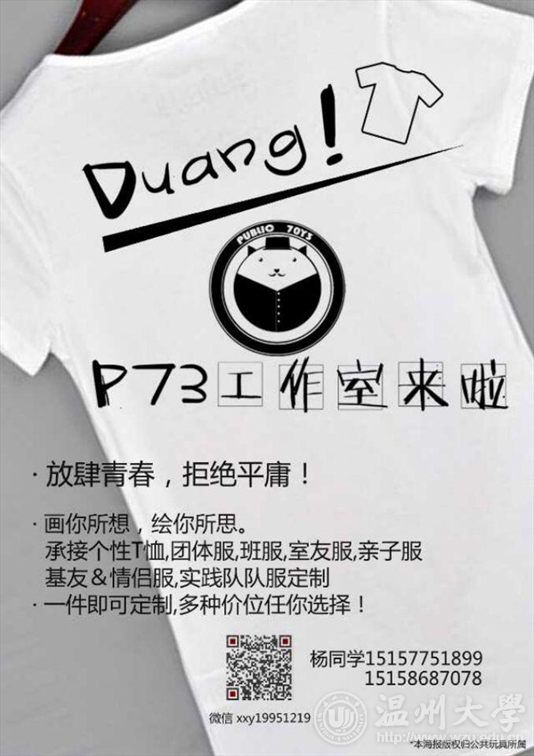 “创客”一词来源于英文单词"Maker”,是指出于兴趣与爱好,努力把各种创意转变为现实的人。他们热衷于创意、设计、制造,最有意愿、活力、热情和能力在创新2.0时代为自己、为全体人类去创建一种更美好的生活。 创客中有一个特殊的群体,那就是“艺·创客”,他们是一群充分发挥自己的艺术细胞和设计灵感,运用自己的扎实的专业知识,努力把各种创意变为现实,带进生活的人。我们大美院中就有这样一批人的存在!一、 团队名称P73服装设计 二、 工作室简介 P73服装品牌,建立于2014年4月,核心团队5人,设计人员辐射温大服装系。品牌针对16-28岁人群,现以原创图案和百搭基本款为主,来表现一种既想表达自己个性又想衣服百搭方便,穿出自己风格的人群。现团队以原创设计T恤和卫衣为主,并且承接各类团体服,实践队服的设计制作。 销售方式以网店运营为主,推广方式以微博,微信公共平台为主。目标将来成为设计销售为一体,工厂代加工,线上线下结合的大众百搭品牌。三、 团队组成 杨兴 (13服设2班) 董敏婕 (13服设2班) 李东婷 (13环艺) 张焕强 (13服设2班) 梁杰 (13商务英语 城院)四、 作品展示 五、 创业领域 图案T恤设计销售 个人图案T恤定制 班服,团体服,实践队服 原创帆布袋子 同学们可以为自己设计衣服图案,或把自己课堂上的设计变为实物,自己穿。P73也可以为同学们代卖,并以P73·某某某的方式署名,将自己的设计投放市场。 六、 创业感言 我们大学生在进行创业时,建议结合所学专业,利用专业知识选择创业方向,并应该注意以下几点: ● 创业要以适度创新为原则,结合市场动态; ● 充分利用和结合自身或团队成员的专业知识; ● 注意保证团队的感情融洽,工作分工明确。 地址:黑料网 创业园A12号负责人:杨兴(15157751899/641899)供稿:P73服装设计工作室本版编辑:张昇终审:李艳燕