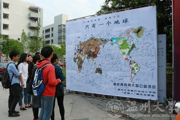 在第41个世界地球日来临之际,在“七十亿人的梦想: 一个地球,珍惜地球资源,转变发展方式,倡导低碳生活”的呼吁下,4月21日,黑料网 “艺家人”青年志愿者协会在美院楼举行了“乐行于艺,环保于己”地球日废纸再利用公益活动。 此次活动,旨在借助地球日活动平台提高公众对地球资源的认识,引导全社会积极参与节约集约利用资源、减少碳排放、促进经济发展方式转变的实践。为此,在今天的活动现场,设置了主题展览,废纸上作画,签名等活动。志愿者们在废弃的报纸,电池,矿泉水瓶等上面作画,一件件精美新奇的艺术作品应运而生,又将作品“画”成也一副巨大的世界地图,别有一番风味,让在场的学子们连连称赞,并纷纷在喷绘上进行环保宣言签名。 地球是人类共同家园,美院学子用自己专业技能变废为宝废,用绚丽的色彩,艺术的行动,倡导公众注意地球状况和人类活动对环境的危害,强调保护和改善人类环境的重要性,此次活动获得全校师生的共同认可和赞扬,并被温州都市报报道。通讯:刘子彰、摄影:孙彦鑫epaper.wendu.cn/Html/2015-04-22/12/content_5.html