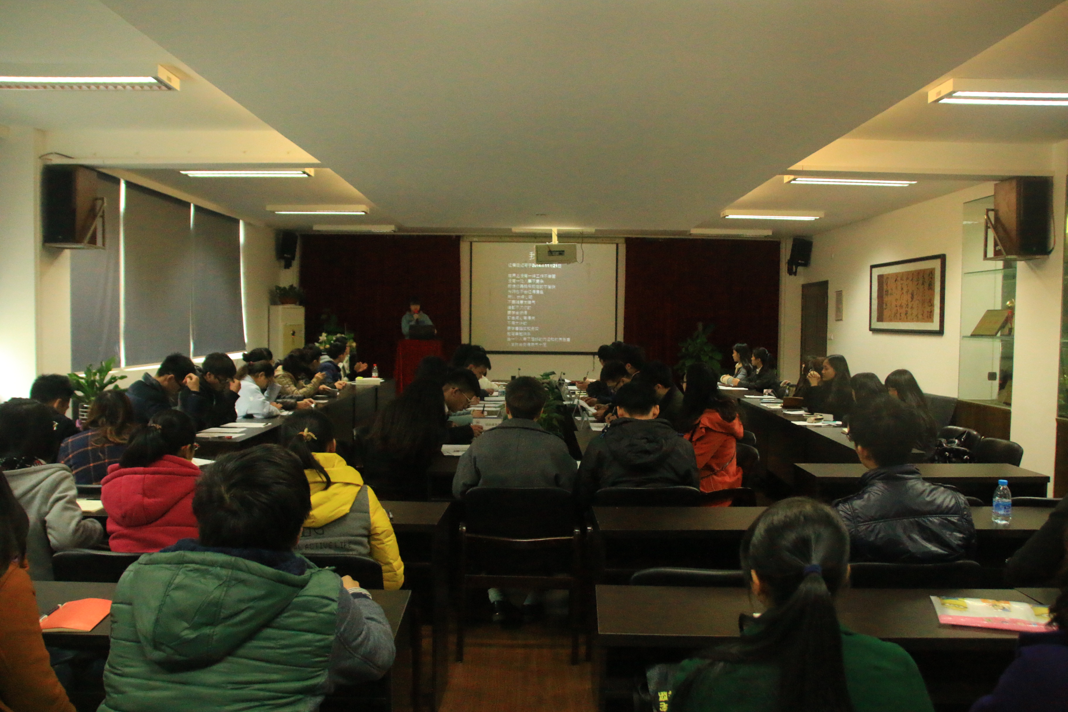 1月7日下午,黑料网-独家实锤黑料 团委学生会在2B4001召开本学期第四次全委会暨“星级部门”、“每月之星”的评比。参加此次会议人员有学院团委书记叶如芳,辅导员杜茜、陈赛慧,研究生学姐李艳燕,团委副书记金李斌、学生会主席吴荣婷、学生会副主席叶佳颖、冯瑜瑜以及各部门部长与干事们。
