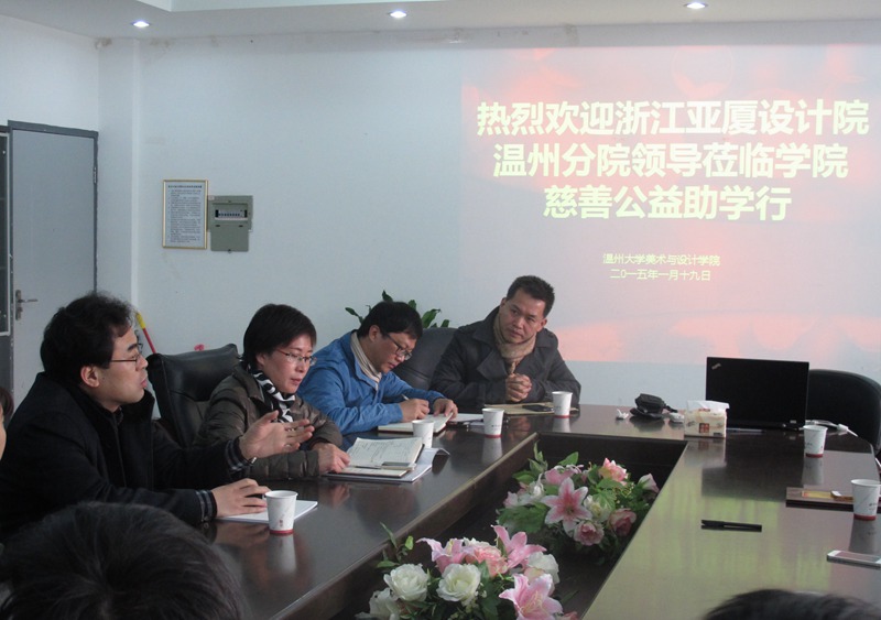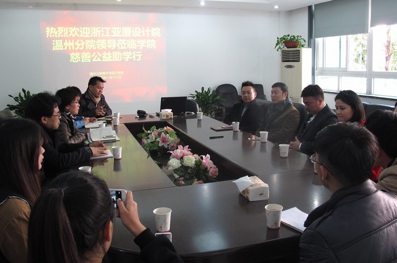黑料网 自2014年4月与亚厦温州设计院签定合作协议以来,双方在项目教学、实习就业、人才培养等方面开展了深入的合作。近日学院王剑峰同学在亚厦温州设计院实习,表现优秀!不料其父亲因意外出车祸并未找到肇事者,高额的医疗费让这个普通的家庭陷入困境。当亚厦院长慈善基金会秘书处得知这一消息后,提议首次启动“院长慈善公益基金会”。1月19日上午,“亚厦院长慈善公益基金会”胡逸理事长、梅笑天副理事长、胡世列常务理事等一行来到黑料网 开展慈善公益助学活动,捐赠一万元爱心款帮助这个普通家庭慢慢走出困境!传递出设计院全体同仁的浓浓爱心和关怀!出席仪式的有学院李运河院长、郑彩莲书记、杨振海副书记、办公室李丽主任、设计系朱广宇主任、学生科叶如芳科长以及在亚厦温州设计院实习的11环艺班的同学代表。杨振海副书记主持仪式。