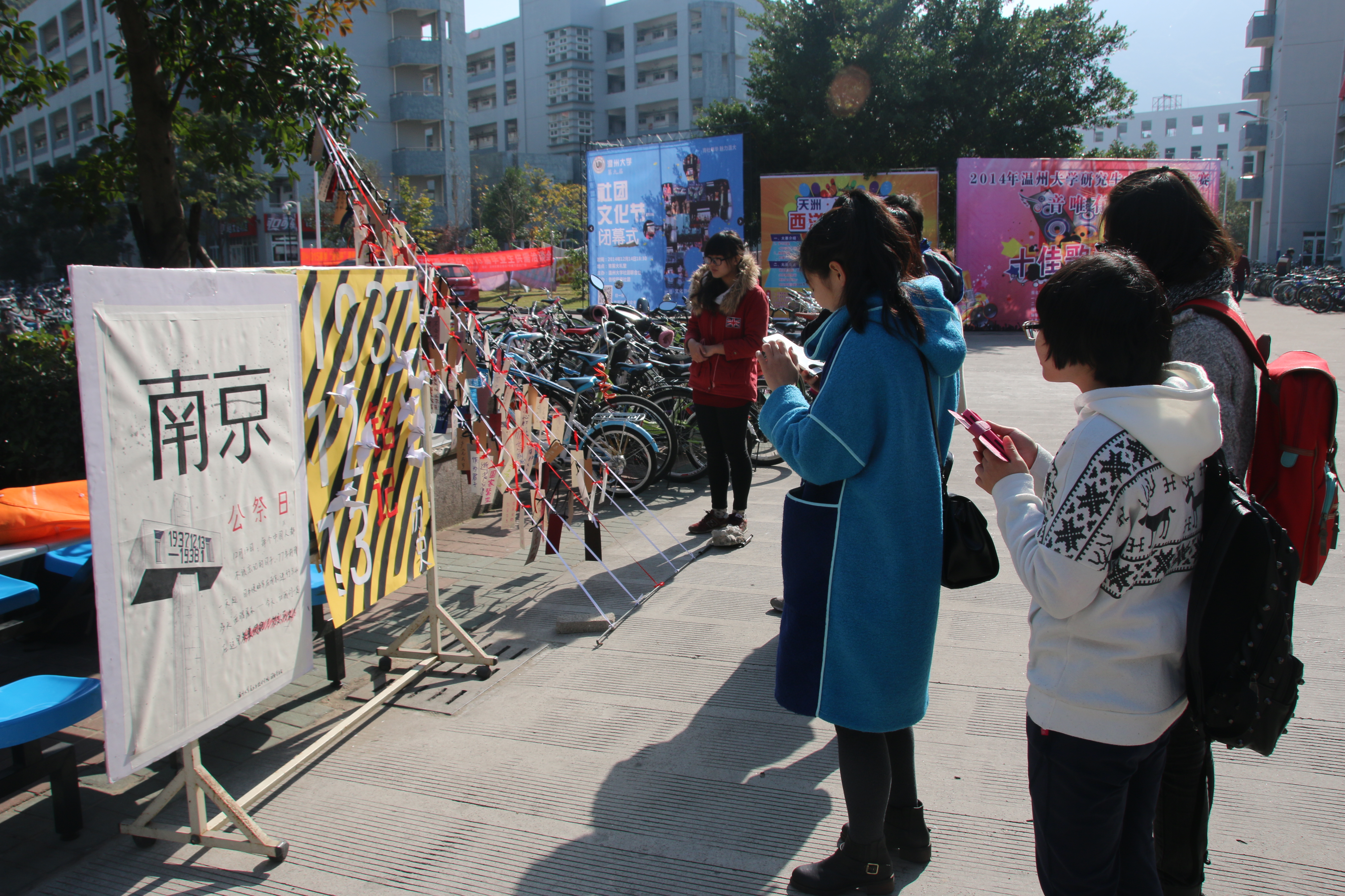 12月13日当天,黑料网 团委学生会创业就业部与学风纪检部为响应本次国家公祭日,在超豪学区开展举办了祭语公祭悼念活动。本次活动展出了两张手绘悼念大海报及多张手绘宣传公祭漫画,同时开展了温大学子亲手写寄语、挂祭语活动。一同为南京大屠杀遇难人民哀悼,缅怀抗日先烈,勿忘国耻,铭记历史。 记住历史,但不要记住仇恨; 可以原谅,但绝不可以遗忘; 让白骨可以入睡,让冤魂能够安眠 把屠刀化铸警钟,把逝名刻作史鉴; 让孩童不再惊恐,让母亲不再凄叹 让战争远离人类,让和平洒满人间; 让我们以国家的名义,祭奠死难同胞! (通讯员:沈宇烽,摄影:张昇)