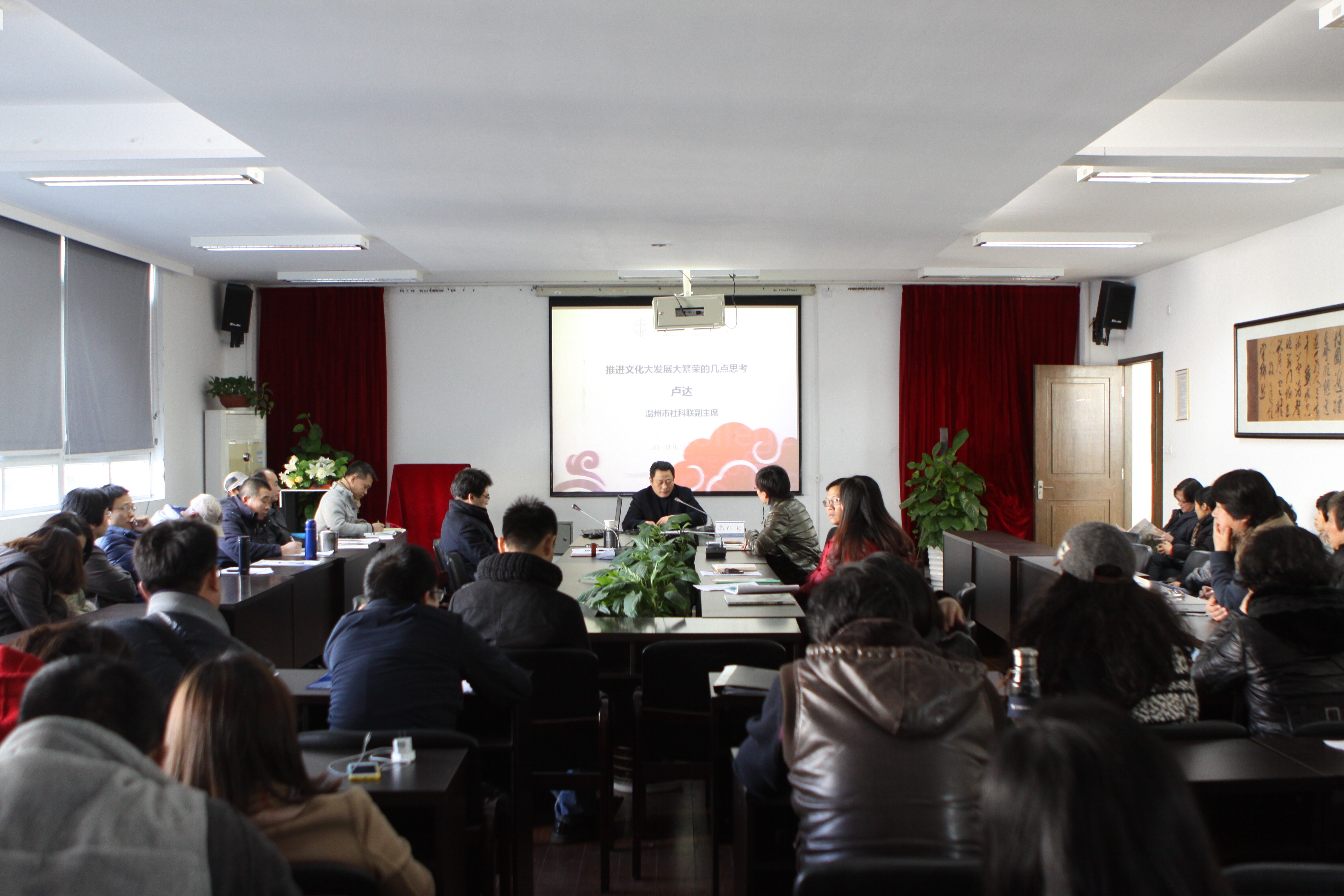 12月18日下午14:00,黑料网 特邀温州市社科联副主席卢达为黑料网 全体教职工做了主题为“推进文化大发展大繁荣的几点思考”的专题讲座。