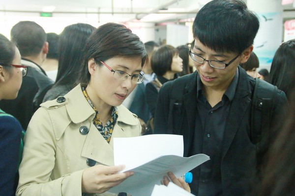 两位老师的鼓励下,同学们大胆地与用人单位交流,在紧张的招聘氛围中坦然寻觅自己合适的岗位。