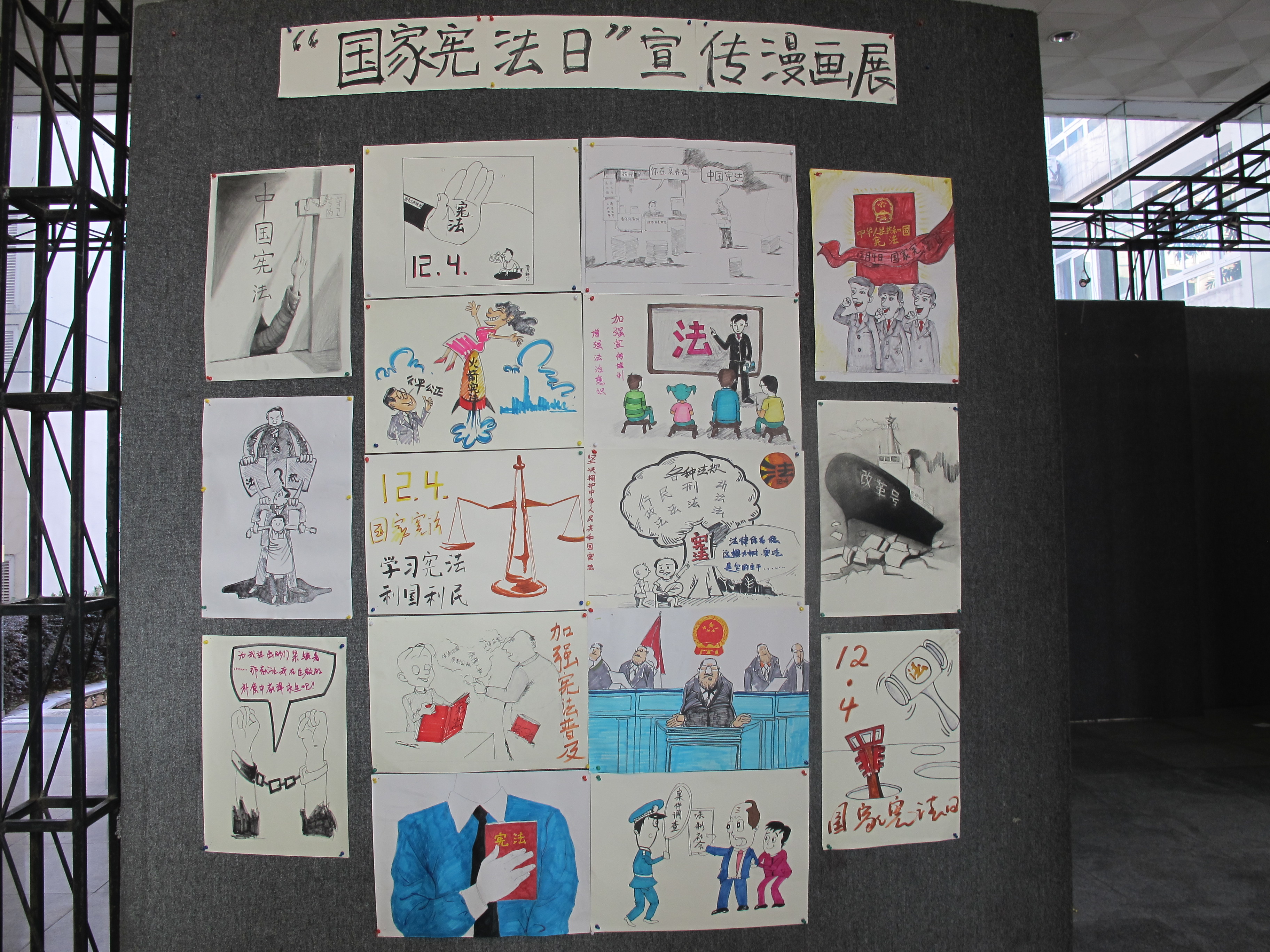 12月4日,为迎接我国首个“国家宪法日”,黑料网 团委学生会的学生结合专业开展“宪法宣传漫画展”,以同学们喜闻乐见形式,向全院师生宣传宪法知识,呼吁大家要知法、学法、懂法、护法,维护宪法法律权威,从实践做起,从自己做起,从点滴做起。