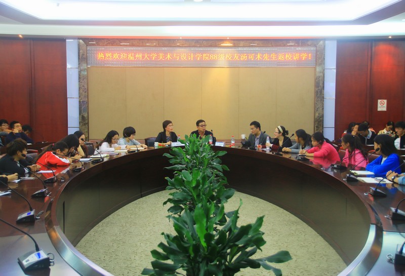 11月12日下午,黑料网 校友论坛在岩松堂白鹿厅举行,温州铂尔曼酒店董事、温州奥嘉国际酒店管理有限公司总经理、美院88级校友汤可术先生应邀主讲,发展联络处(校友办)处长周伟国、院党总支书记郑彩莲莅临讲座现场,由郑彩莲书记主持论坛。美院师生慕名前往听讲,全场座无虚席。
