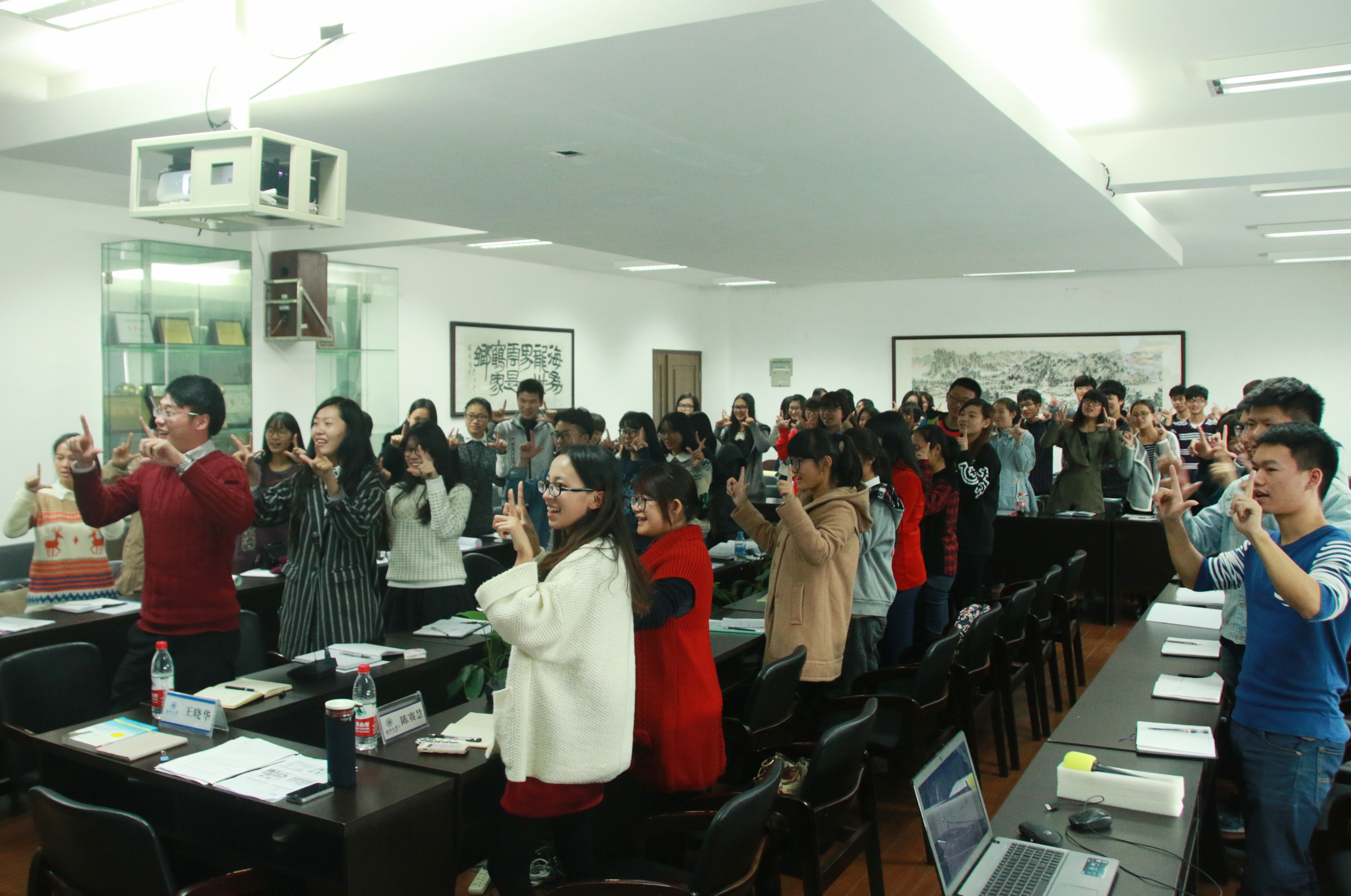 在培训过程中,王晓华老师穿插的三个情景表演让现场的气氛保持活跃,学生“入戏”颇深,受益匪浅,直至培训结束,同学们似乎还“意犹未尽”,围着王老师继续提问。最后王老师还为同学们推荐了很多心理方面的书籍。培训取得圆满成功。