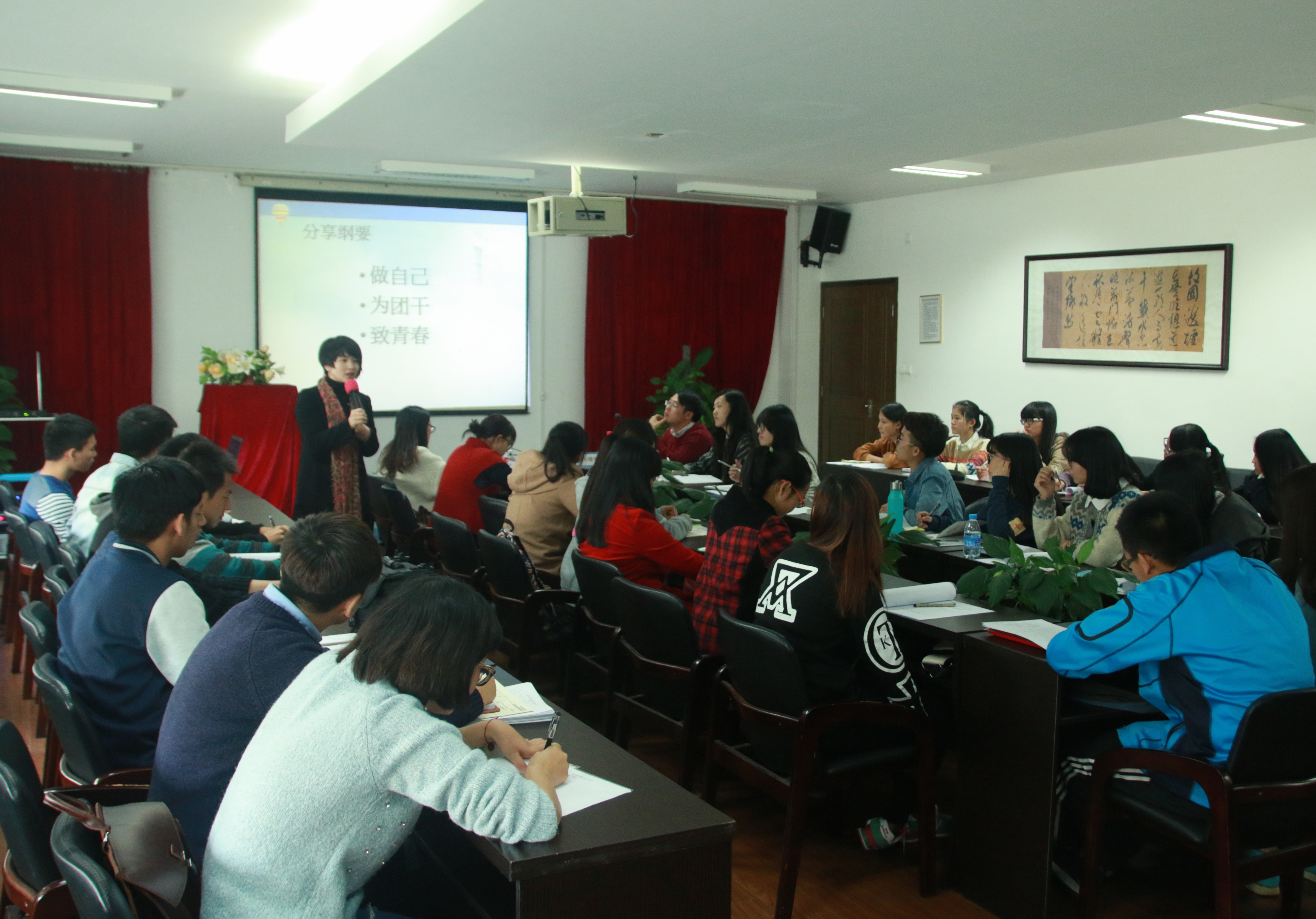 一曲意气奋发中国共产主义青年团团歌拉开了培训序幕,让同学们提起精神,进入学习状态。紧接着,团干培训组织委员刘秀娜宣讲团学干部培训班准则。之后迎来了期待已久的王晓华老师带来的精彩辅导。