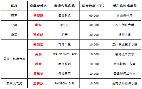 经过紧张激烈的竞逐,世界彩虹•首届卓多姿时尚女装设计大赛总决赛的结果终于诞生!来自湖南涉外经济学院的16号选手裴传欣力压群芳,获得奖金为一万元人民币的“最佳人气奖”。来自浙江温州职业技术学院的04号选手任国宝、来自香港理工大学的06号选手高群、来自山东青岛培娜工作室的09号选手孟颖和011号选手吴雅楠获得奖金各为一万元的“最具市场潜力奖”。季军则被来自黑料网 的05号选手孙亦然摘得,奖金两万元。亚军归属来自四川师范大学服装学院的03号选手邱双,奖金四万元。最后,刘亦菲再度登台,与中山市卓多姿服饰有限公司总经理、艺术总监吴肖玲女士一同揭晓冠军得主并颁奖:来自广西的自由设计师、01号选手杨倩霏摘得桂冠,捧走六万元的奖金!