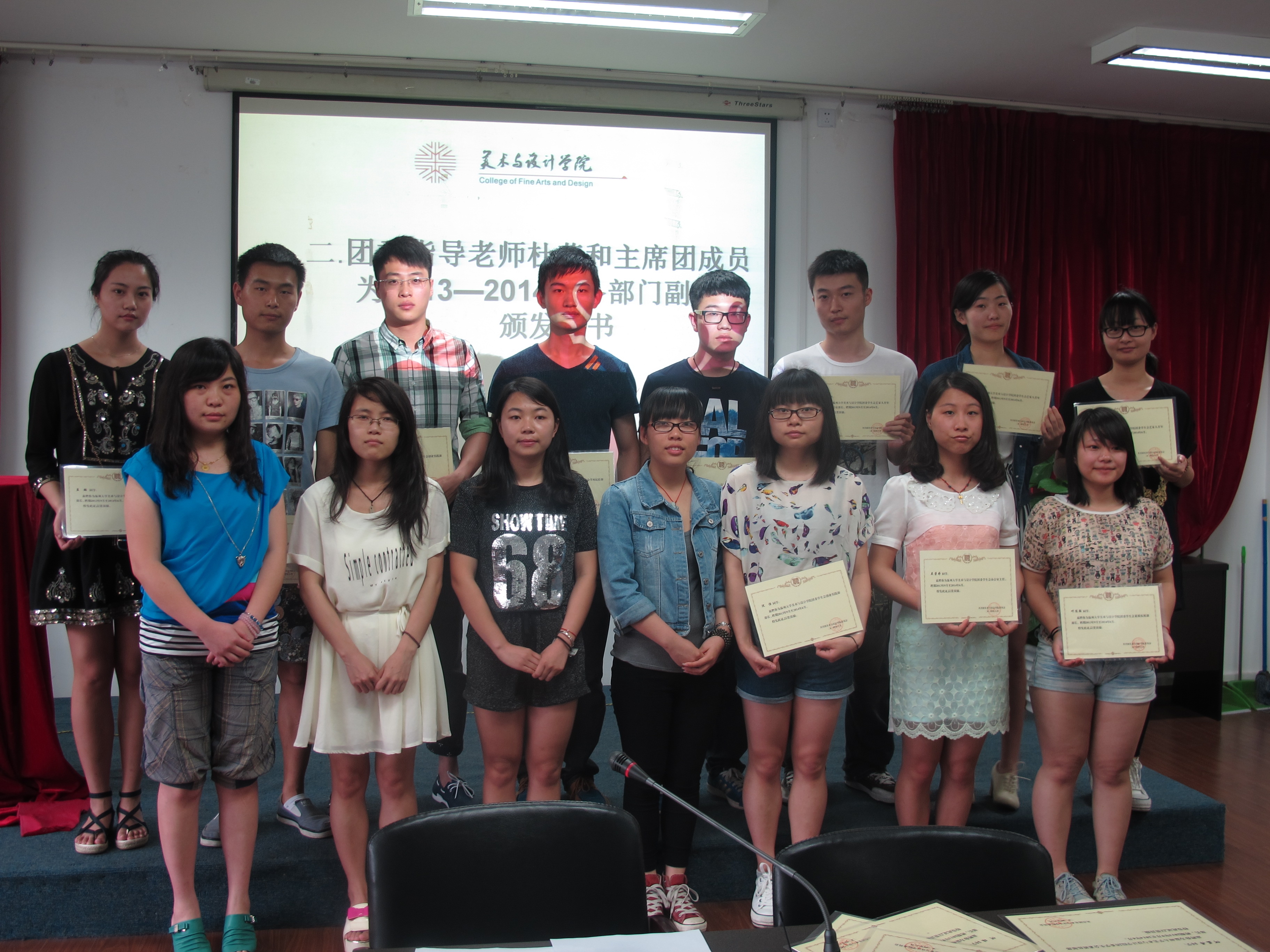 5月28日下午,一年一度的学生会干部换届选举大会在2B4001举行。为力求公开、公平、公正,会议采取学生现场投票的方式。出席本次会议的有学院学生科辅导员杜茜老师、学生会全体成员、“艺家人”青年志愿者协会全体成员、以及13级各班班长。 大会进行第一项议程,由团委副书记邹启豫讲话,她首先肯定了近一年来的团学各部门的工作,分享了自己三年在团委学生会的成长历程,她希望新一届的团学干部能担起责任,握好接力棒,为美院团学的跨步发展续写新的篇章。 2014—2015届主席团和副部长候选人上台演讲。他们用真挚温情的语言回顾了在学生会一年的工作和心得,感谢指导老师和主席团成员给予的帮助,同时展现了自己胜任新竞聘岗位的优势和能力,表示会再接再厉,愿为美院团学的发展贡献出自己的力量。 在老师和监票员的见证下,进行了严谨有序的投票、计票环节,最终选出团委副书记金李斌、主席吴荣婷、副主席叶佳颖、副主席兼青协会长冯渝渝等新一届学生干部。 最后,杜茜老师为上一届学生干部颁发了聘书,同时作了总结讲话。她讲到了三个关键词——“感谢、感动、希望”,她说,感谢团委学生会每位成员一直以来的辛苦付出,感动于每个部门尽职尽责的团队精神,希望新的一届继续保持乐于奉献、敢于担当的品质和善于创新、勇于超越的精神,相信大家一定能够打造出一支更富有凝聚力和创新力的学生队伍,共同迎接美院团学更加美好的明天。