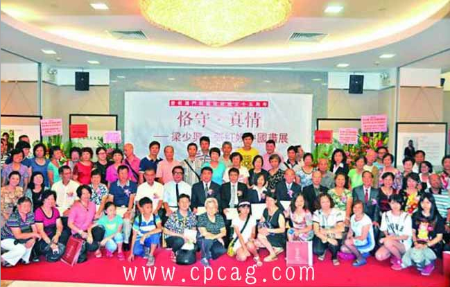 展览开幕式八月廿六日傍晚六时假街总小区服务大楼举行,中联办文教部副部长张晓光,外交部驻澳门特区特派员公署公共外交和新闻部副主任李孝劝,澳门特区民署代表李仲熙,澳门特区检察院代表梁丽霞,澳门特区街总会长姚鸿明,澳门特区日报常务副总编辑黎胜培,番禺政协副主席彭群,霍英东基金会总干事史濠,黄云美术馆名誉馆长曾肖燕,广州花都美居中心董事长苏燕,华夏文化艺术学会主席李金浩、会长关权昌,番禺政协委员兼策展人邱绮文,在梁少兴、张红嫚陪同下主礼。