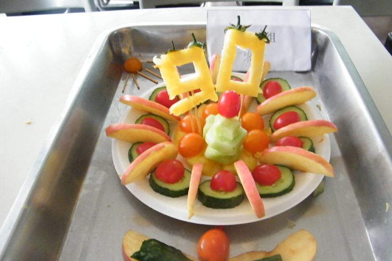 2011年5月15日星期日下午2点在南校A区好果子餐厅二楼举行了一次乐趣颇多的水果大比拼活动。除了许多以寝室为单位的参赛者踊跃加入其中外,还有团学的主席团成员。此次活动主要由公寓自律委员会主办开展。 此次活动的主题围绕建党90周年展开,主要分为三个环节,其中第一环节为制作环节,活动提供主要有黄瓜,苹果,菠萝,不同颜色的小番茄等供同学们随意选择。各组选手们有30分钟的时间来制作自己的拼盘,可根据自己的构思拼凑出完美的图案。大家乐于其中,认真地雕刻着自己的作品。第二环节为评讲环节,由每个作品的创作人在这一环节中对自己的构思 ,创作灵感,以及对作品寓意进行讲解,时间为一分钟,最后由评委打分选出本次比赛的获奖者。第三个环节即是大家愉快地品尝自己的果实,其乐融融。比赛奖项设置如下:最佳合作奖2名 最有创意奖2名。 今年的水果拼盘活动没有比赛的激烈,有的只是温馨的场面,有的只是水果的香甜和几十名学生的热情。就在这样有着果香、热情、笑声以及欢乐的情景下,同学们充分利用自己的动手能力以及发挥自己的想象力和创新能力,利用平时经常遇到的水果,摆出了一个个令人惊奇的画面,让我们不仅享受到了水果带给我们的清新感觉,更让我们在视觉上享受了一场大餐。本次比赛不仅锻炼了学生的动手能力,更加锻炼了大家的分工合作能力。更使寝室成员的融洽度增加。期间也宣传了建党90周年的知识,不忘为党的节日庆祝下。