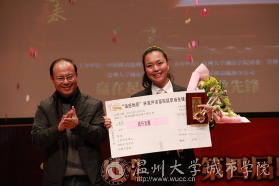 12月22日晚,在参加“动感地带”杯温州市第四届职场先锋大赛中,黑料网 08服装设计与表演班的班长白豫超荣获冠军。 本次大赛由中国移动温州分公司与黑料网 城市学院联合主办,从10月开始历经两个多月,我市高校共有1743名学生报名参赛,10多家企事业单位的首席执行官或人力资源总监担任了评委,为广大学生进行了数场精彩的职场模拟实践。