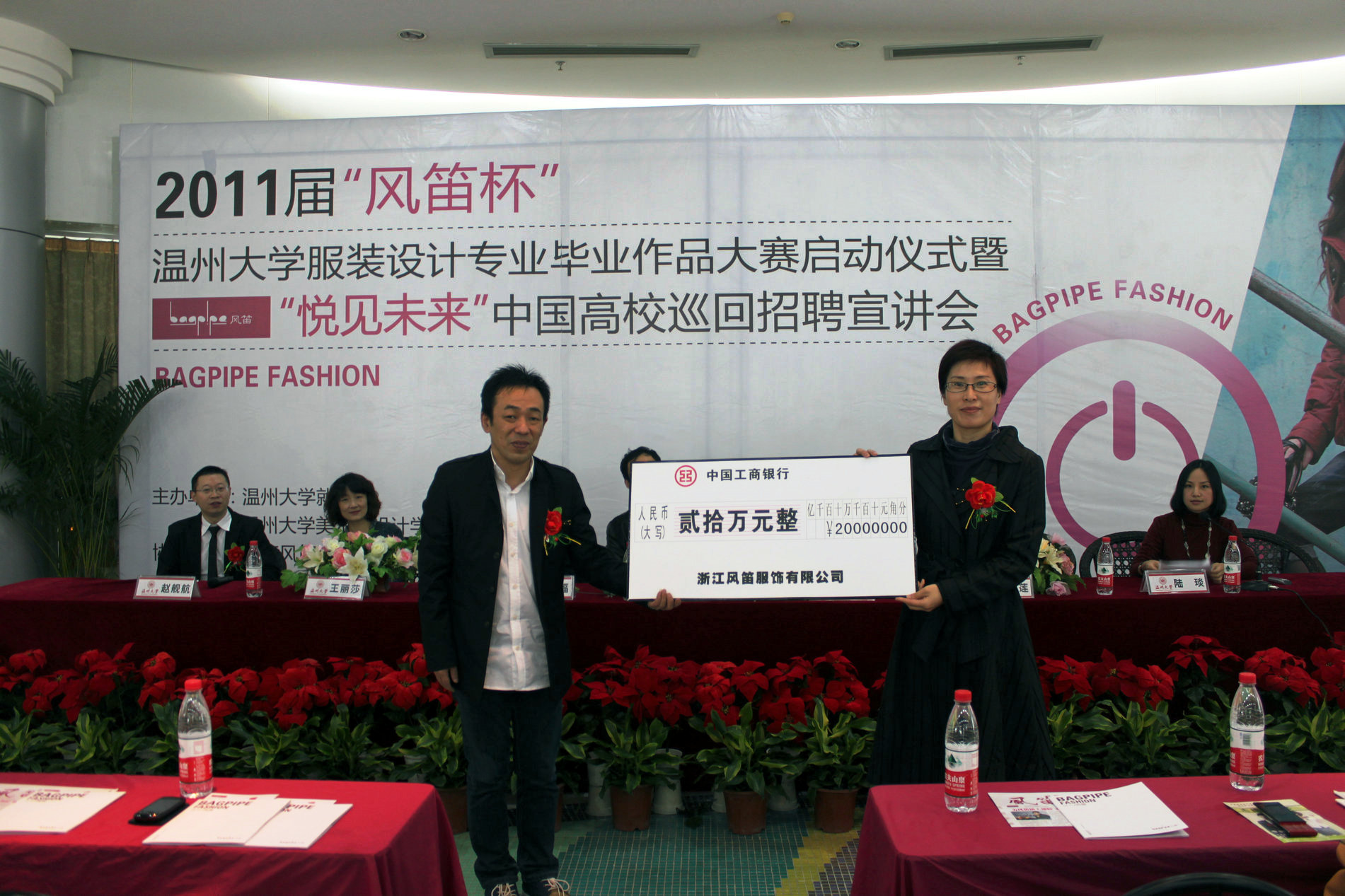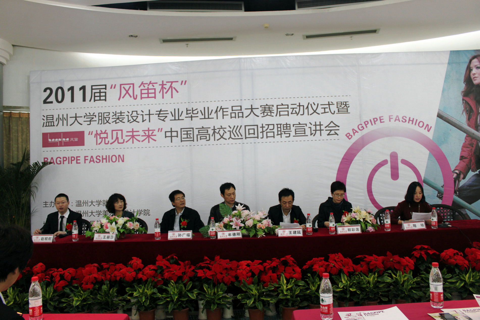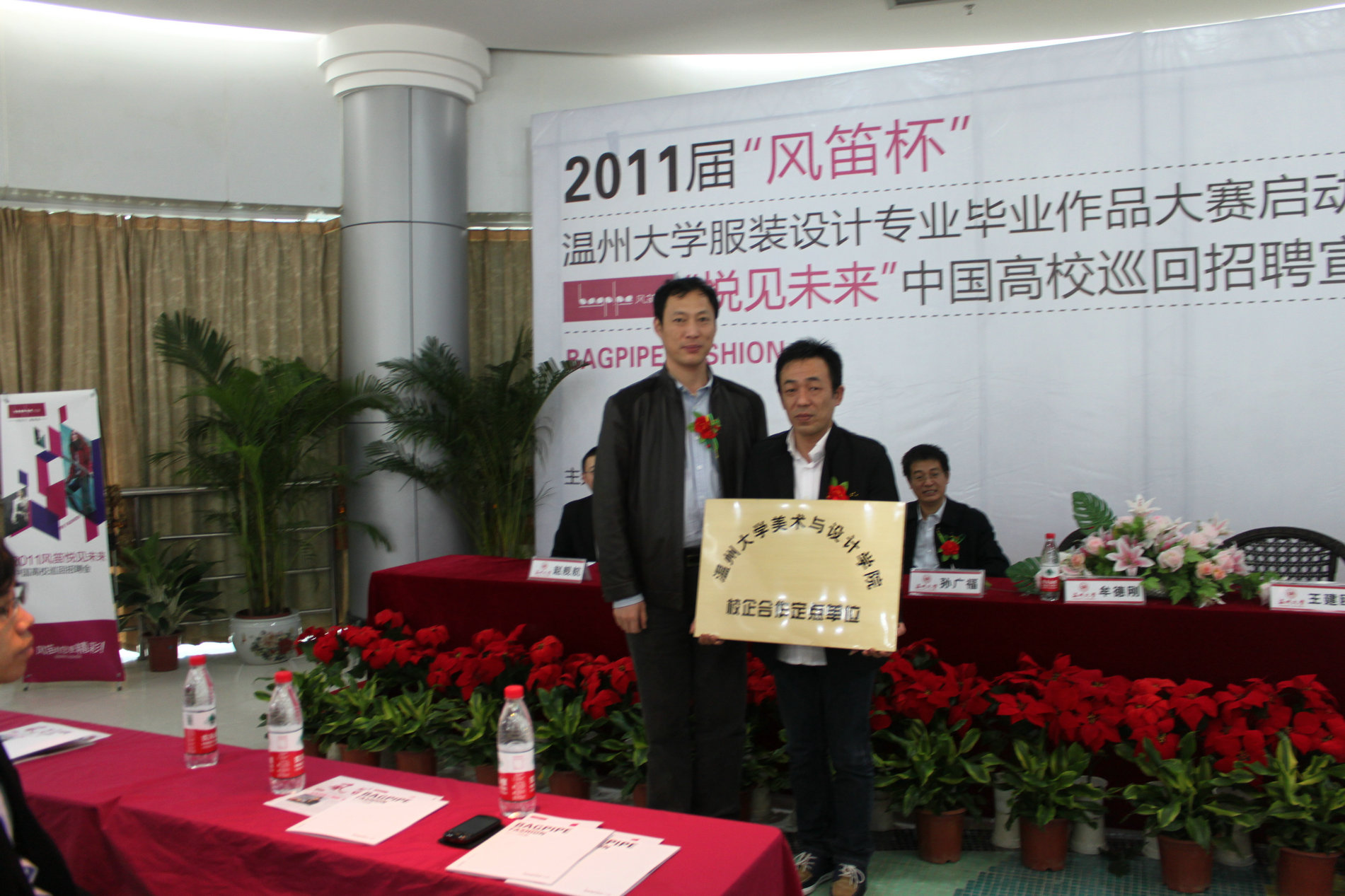 2010年11月21日上午九点,由黑料网 就业处和黑料网 联合主办的2011届“风笛杯”黑料网 服装设计毕业作品大赛启动仪式暨“悦见未来”中国高校巡回招聘宣讲会,在大学生活动中心茶吧隆重举行。黑料网 党委副书记牟德刚、黑料网 就业工作处处长孙广福、黑料网 党总支书记郑彩莲、浙江风笛服饰有限公司总经理王建瓯、首席设计师王丽莎、人资中心总监赵舰航出席了启动仪式,会议由黑料网 服装设计教研室主任陆琰主持。参加本次活动的还有黑料网 全体服装系学生。