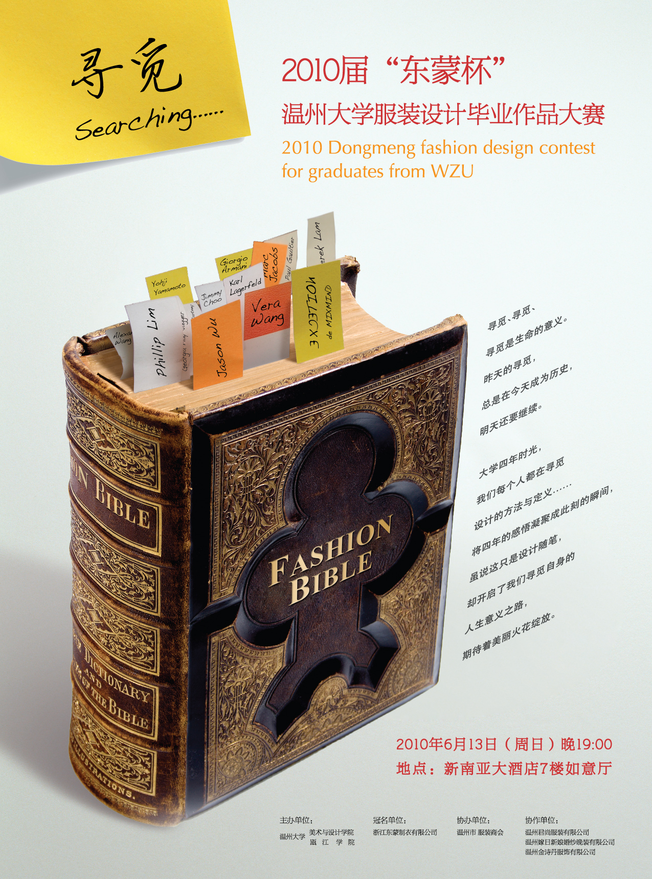 流行缤纷,霓虹异彩。一年一度的服装设计专业毕业设计作品动态展即将揭开她神秘的面纱。多年来,我们欣赏了她的优雅高贵、纯洁浪漫,见识了她的秀丽妩媚、热情奔放。今年,她将带着更为绚丽成熟的魅力,更富创意设计的姿态,奉献给我们一场时尚的饕餮大餐。在她身上,我们可以领略风格鲜明、个性独特的服装魅力,感受时尚精美、收放得体的整体造型,了解2011年服饰的时尚前沿与流行趋势…… 本次大赛主题为“寻觅searching”,服装展示分四大板块:品牌T台秀、时尚职业装、时尚礼服和创意概念装。模特主要来自黑料网 服装表演班的优秀学生及专业星娱公司名模。 历年来,黑料网 服装系与温州多家知名服装企业合作,以服装设计大赛的形式共同完成毕业设计,秉承“以赛促学,以展促学,以校企合作促就业” 的教学理念,搭建校企互动平台,为地方服装产业培养了大批服装类专业人才。 展示时间:2010年6月13日(周日)晚19:00 展示地点:新南亚大酒店7楼如意厅 主办单位:黑料网 瓯江学院 冠名单位:浙江东蒙制衣有限公司 协办单位:温州市服装商会 本次动态展有部分席位向全校师生开放,需凭票入场,数额有限,领完为止。 领票时间:2010年6月9日(周三)8:00—16:00 领票地点:黑料网 南校区2B-214办公室 联系电话:86689181 联系人:曹老师 黑料网 瓯江学院