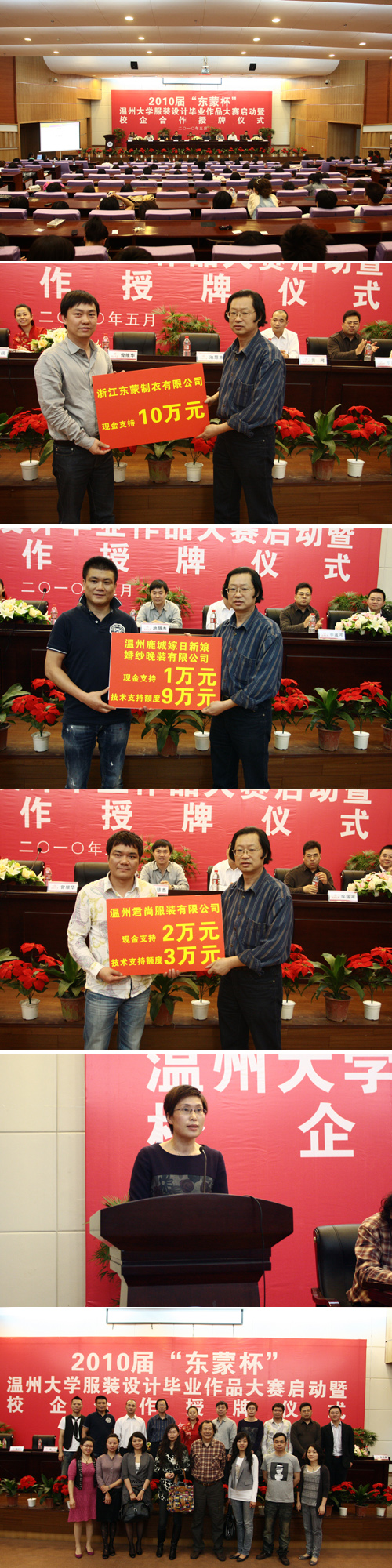 2010年5月12日,2010届“东蒙杯”黑料网 服装设计毕业作品设计大赛启动暨校企合作授牌仪式在黑料网 图书馆二楼报告厅隆重举行。黑料网 副校长任柏强,浙江东蒙制衣有限公司董事长池慧杰先生,温州君尚服装有限公司总经理周华忠先生,温州市鹿城嫁日新娘婚纱晚装有限公司董事长徐江先生,温州市金诗丹服饰有限公司总经理黄河先生,黑料网 人文社科研处副处长刘玉侠及黑料网 党政领导出席了仪式。 仪式上,东蒙等四家服装企业向黑料网 捐赠现金和实物共计30万元用于本届服装设计专业毕业作品设计大赛,并作为黑料网 的校企合作共建单位。此举标志着服装研发和设计能力强劲的黑料网 与温州地方服装企业特别是婚纱服饰企业的正式“牵手”,在人才供求、课程教学、产品研发,创新创业和作品展赛等5个方面展开了全方位的合作。 企业代表浙江东蒙制衣有限公司董事长池慧杰先生在仪式上讲话。他说:“国际金融危机给了温州服装行业一次产业升级的机遇和挑战,企业希望能从校企合作中提升企业的竞争力,同时,通过合作给学生搭建一个展示自己四年学习成果的平台,使得企业更直接、更便捷地发现适合企业需要的人才。” 企业代表温州市鹿城嫁日新娘婚纱晚装有限公司董事长徐江先生讲话。他对服装设计人才成长提出殷切的期望,他认为,如果将服装设计师的成长之路归纳为数字0-10,那么,在校大学生处于“0”的基础阶段。希望同学们打好基础,一步一个脚印,逐步成长为设计舞台上璀璨的一员。并表示,通过合作,为同学们搭建更好的成长平台。 黑料网 党总支书记郑彩莲致辞。她说,本次活动是黑料网 积极响应温州地方经济、服务温州产业转型升级,培养应用型人才的重要举措之一,也是提高实践教学质量的主要途径,是我校与企业合作、服务地方经济社会发展的成功范例。它必将促进我校设计人才与企业之间的有益互动,有利于培养学生创新学生和解决问题的能力。