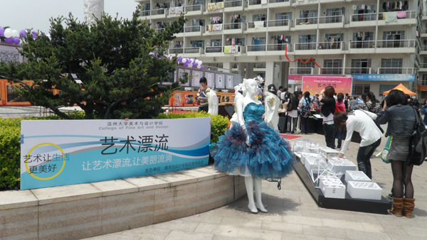 2010年4月28日对同学们来说是再普通不过的日子,与往常一样的早起赶上课、下课冲食堂。然而今天,许多同学却停下了匆匆的脚步,被一些创意独特的鞋靴、服饰等吸引,纷纷驻足在温大生活区A区,欣赏由温大黑料网 主办的“艺术漂流”巡回展览。
