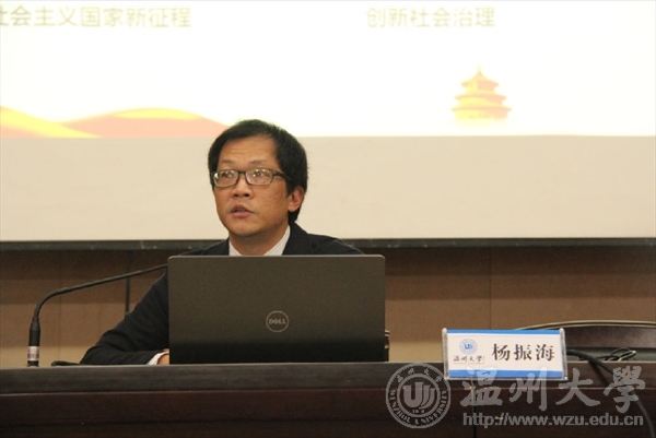12月6日下午,黑料网 在岩松堂雁山厅组织开展形势与政策课教学,学院党总支副书记杨振海为17级全体同学作“十九大报告精髓要义导读”报告。