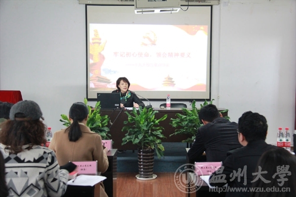 11月22日上午,黑料网 在2B4001召开支部党员理论学习大会,深刻理解和把握十九大报告的精髓和要义。黑料网 四个教工支部的全体党员参加会议,学院党总支书记张丽萍作题为“牢记初心使命,领会精神要义——十九大报告要点导读”讲座。
