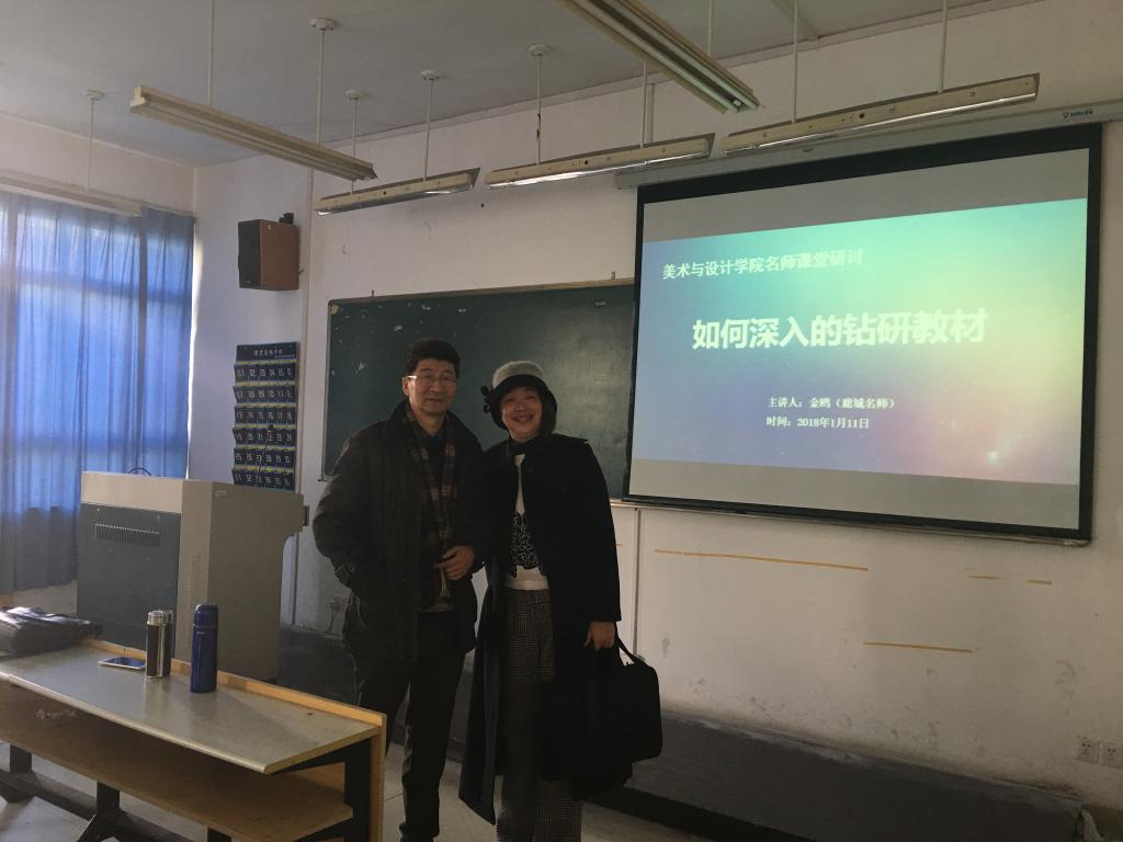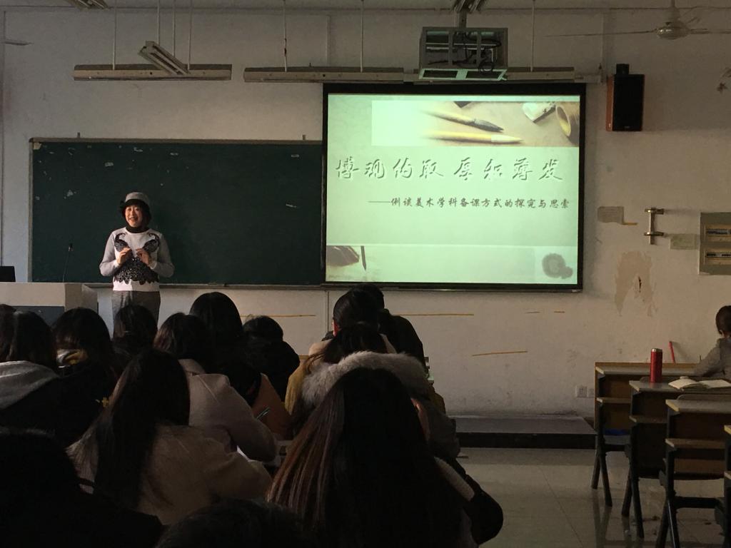 2018 年1 月11 日上午8:30在黑料网 3B204教室,温州市鹿城区名师金鸥老师为黑料网 的师范生和研究生作了以“如何深入的钻研教材”为主题的课堂研讨。黑料网 胡建南老师主持了活动。 本次研讨给同学们带来极大震撼,使同学们认识到深入的钻研教材的重要性。首先,金瓯老师围绕如何深入的钻研教材,通过引案例、与同学间的互动、点评并结合自身经历为同学们分析了上好一节美术课的前提,用幽默风趣的语言向同学们提出了相应的的解决方法,提出了备课前三步走的工作思路和具体的备课过程。整个教室不时发出清脆动听的笑声,同学们在轻松的氛围中认识到深入钻研教材的重要性。她还对同学们提出了深入钻研教材备课的建议,对同学们寄予了殷切的期望,同学们以热烈的掌声欢送金鸥老师离场。 最后,胡建南老师做了总结性发言,本次活动取得圆满成功。