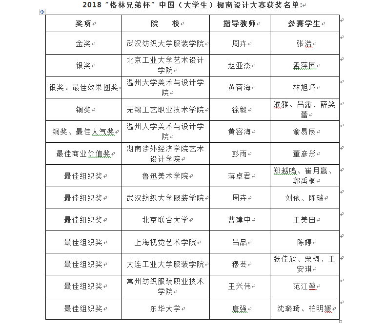 2018“格林兄弟杯”中国(大学生)橱窗设计大赛于5月18日在北京落下帷幕,在当晚举行的尚坤塬·2018中国国际大学生时装周颁奖典礼上,黑料网 黄容海老师指导的14服装展示班两位学生的参赛作品狂揽4项大奖。林旭环同学的作品《昨日世界》荣获银奖和最佳效果图奖;俞易辰同学的作品《迷恋》荣获铜奖和最佳人气奖。