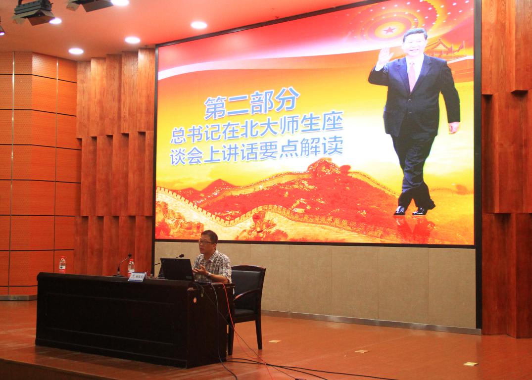 7月4日下午,黑料网 在岩松堂雁山厅组织开展形势与政策课教学,学院党总支副书记杨振海为17级全体同学做“坚持立德树人培养时代青年 加快内涵发展建设高教强国——习近平总书记在北大师生座谈会上的讲话精神解读”报告。 杨书记报告分为三部分,第一部分是总书记莅临北京大学考察的简要回顾,第二部分是总书记在北大师生座谈会上讲话的要点解读,第三部分是学习总书记讲话精神要自觉增强五个自觉。杨书记指出,习近平总书记在北大师生座谈会上的讲话是当的十九大以来,总书记面向高等教育乃至整个教育战线发表的首次重要讲话,对新时代的高等教育工作做出了系统论述,具有很强的战略性、政治性、思想性和针对性,是习近平新时代中国特色社会主义思想的重要内容,是深化教育综合改革、办好社会主义大学的根本遵循,也是青年学生成长成才的行动指南。杨书记认为,总书记的讲话围绕“我们要培养什么样的人”“怎样培养我们需要的人”“青少年怎样成为这样的人”三个问题,分别从我国高等教育的一个根本任务、建设中国特色世界一流大学的三项基础性工作和对新时代青年的四点希望三个方面进行了深刻阐述。杨书记总结了学习总书记讲话精神要增强五个自觉,一要增强走中国特色社会主义道路的自觉;二要增强加快高等教育内涵式发展的自觉;三要增强高等教育服务国家和社会的自觉;四要增强高校加强和改进党的领导的自觉;五要增强青年大学生全面成长成才的自觉。 最后,杨书记勉励全体同学要不忘初心,牢记使命,关注时事政治,努力充实文化知识和专业技能,为实现中华民族伟大复兴的中国梦贡献青年大学生应有的力量。