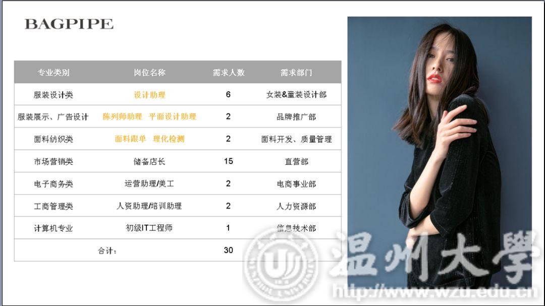 10日19日上午,Bagpipe风笛2019无限想象全国高校巡回宣讲会在美院顺利展开。在多年的合作与交流当中,风笛与温大也结下了不解的情缘。本次宣讲会有学院党总支副书记杨振海与风笛服饰有限公司经理吴朝晓莅临宣讲会现场。 首先是杨书记致开场词,在同学们热烈的掌声中,杨书记侃侃而谈。“温州风笛服饰有限公司与温大美院搭建了一个非常典型的校企合作平台,风笛公司作为我校省级校外实践教育中心,与黑料网 在专业教学、实习实训、就业创业等领域开展全面战略合作,我们非常高兴看到风笛公司一直以来欣欣向荣的发展态势,也希望双方能携手结出更多合作成果。” “不忘初心,使命必达。”风笛宣讲人缪老师在分享风笛创始人创业史、发展史,讲述风笛的过去、现在与未来,同学们都听的津津有味。宣讲会在主持人和同学们的互动中开始后,主持人分别从公司品牌设计风格,员工的衣食住行娱,薪资问题和管培生培养计划等几个同学们关心的方面来介绍风笛服饰有限公司的细节。BAGPIPE风笛成立于1999年,是一家自主开发、生产、销售时尚女装和童装的品牌经营企业。风笛公司的女装品牌分为周末时尚,摩登帅气,精致优雅三个风格,而风笛公司的童装品牌的定位则是针对2-8周岁的儿童设计的,风格多样是风笛公司的优势所在。衣食住行方面,风笛公司也非常重视员工的感受,为他们提供了舒适的环境以便于员工们更好的工作和生活。同时,风笛公司也十分重视对人才的培养,也有一套完整的体系进行人才的引入。这便是风笛管培生培养计划的由来。对于进入风笛上班的应届生,风笛建立了完善的“管培生培养计划”,全面打造“一专多能”的复合型人才,让每个进入风笛的应届生迅速成长,成为独当一面的技术或管理人才。在经过由系统培训、店铺见习、核心轮岗和专岗实践四个环节的管培生培养计划之后,实习生便能更好地融入公司这个大集体。说到薪资方面的话题,风笛公司的PPT上有着这样一段话:“一个人,只有自己成长了,事业才会跟着成长。一个人,只有自身价值提升了,薪资岗位才能跟着提升。”从这段话中我们也可以清晰地看到风笛公司对人才和员工能力的重视。对于服装设计、服装展示、广告设计、面料纺织类的专业,风笛公司也提供了如设计助理、陈列师助理、平面设计助理、面料跟单、理化检测的专业让同学们选择,以便给予同学们更大的就业空间。 “风笛未来,无限可期。”这是这场宣讲会的结束语。无限可期的不仅是风笛的未来,也同样是我们美院同学们明媚的未来。正如主持人所说,人生不设限,未来就会精彩无限。我们也相信同学们在一番拼搏之后,会绽放出人生绚丽的芳华。