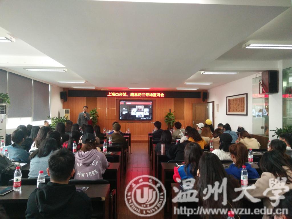 11月23日上午,由上海杰帝梵、路易诗兰组织的黑料网 专场宣讲会在美院2B4001成功举行。出席此次宣讲会的主要宣讲人有杰帝梵和路易诗兰的战略部总经理朱量和培训部经理陈超群。会议内容主要是品牌的概述、管培生项目的介绍以及面试的流程。