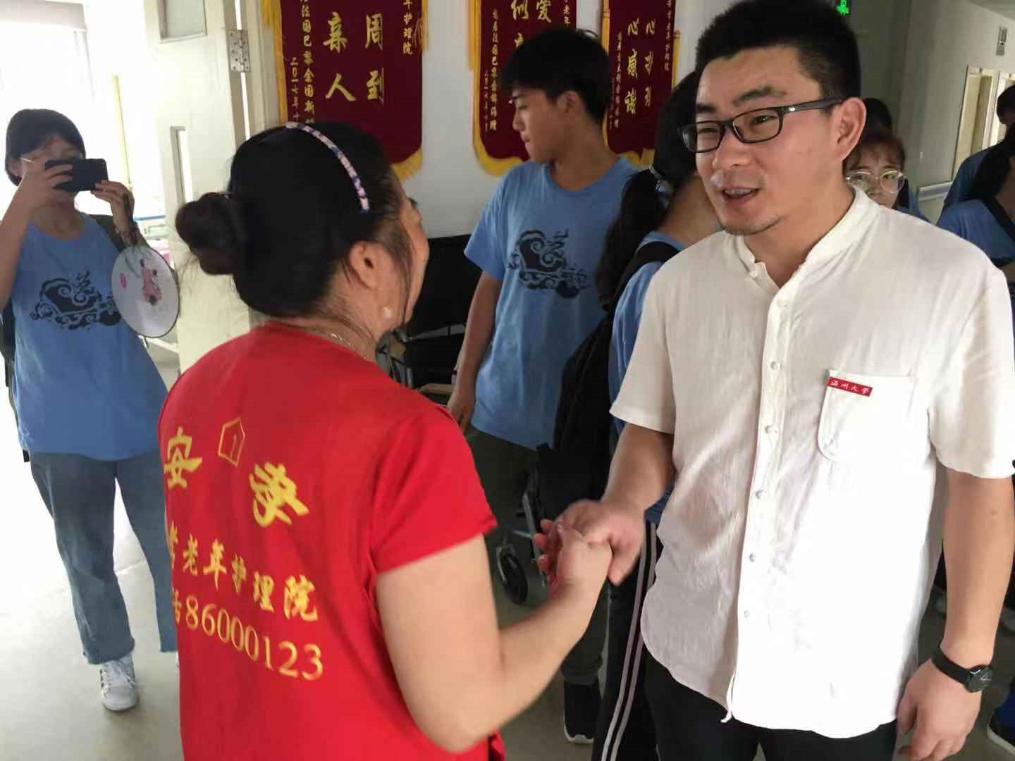 2019年7月18日上午九时许,黑料网 副院长胡文超慰问了正在温州安孝老年护理院关爱老人活动的“艺韵晚霞”暑期社会实践队。初到敬老院,胡院长一行受到实践队员的热情欢迎,通过和队员们简单的交谈后,胡院长进入敬老院里,和敬老院里的护理人员详细了解敬老院的基本情况。