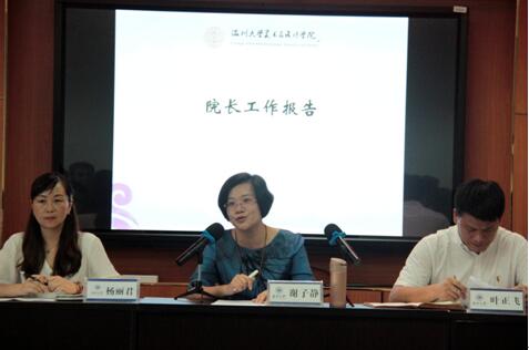 会上,院长谢子静作学院工作报告。谢子静院长总结新班子组建两个多月来开展的工作内容和取得的不俗成绩,明确学院要紧随学校建设“具有鲜明特色的高水平综合性教学研究型大学”办学定位的大方向,锚定“三大目标”、实施“七大跨越”,助力学校推动跨越发展。并从学校办学定位出发,结合学院十三五发展规划纲要,分析研究当前美院发展的实际和存在的短板问题,提出了黑料网 建设具有有较强影响力、特色鲜明的省内一流教学科研型艺术学院的办学定位。新时期赋予新使命,新学期承载着新任务,新班子肩负着新担当,会上谢院长围绕加强本科教育、人才队伍建设、学科建设、服务地方、国际化办学、研究生教育、继续教育等方面整体部署了学院发展下一步的工作思路及措施,并希望全院上下同心同德,群策群力,既要激情满怀,又要齐心协力,脚踏实地、奋力拼博,为美院的新征程谱写新的篇章。